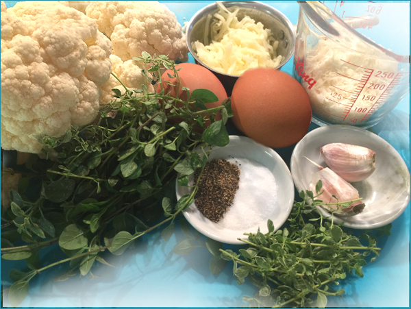 4. Place the cauliflower in a clean bowl and combine with mozzarella,  Parmesan cheese,  eggs, thyme, oregano, pepper and salt.