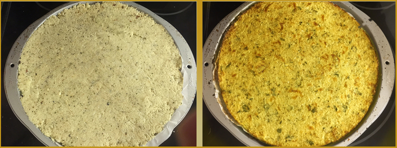 5. Place the cauliflower mix on a pizza pan (or baking sheet) lined with parchment and spread evenly with fingers or a rolling pin.