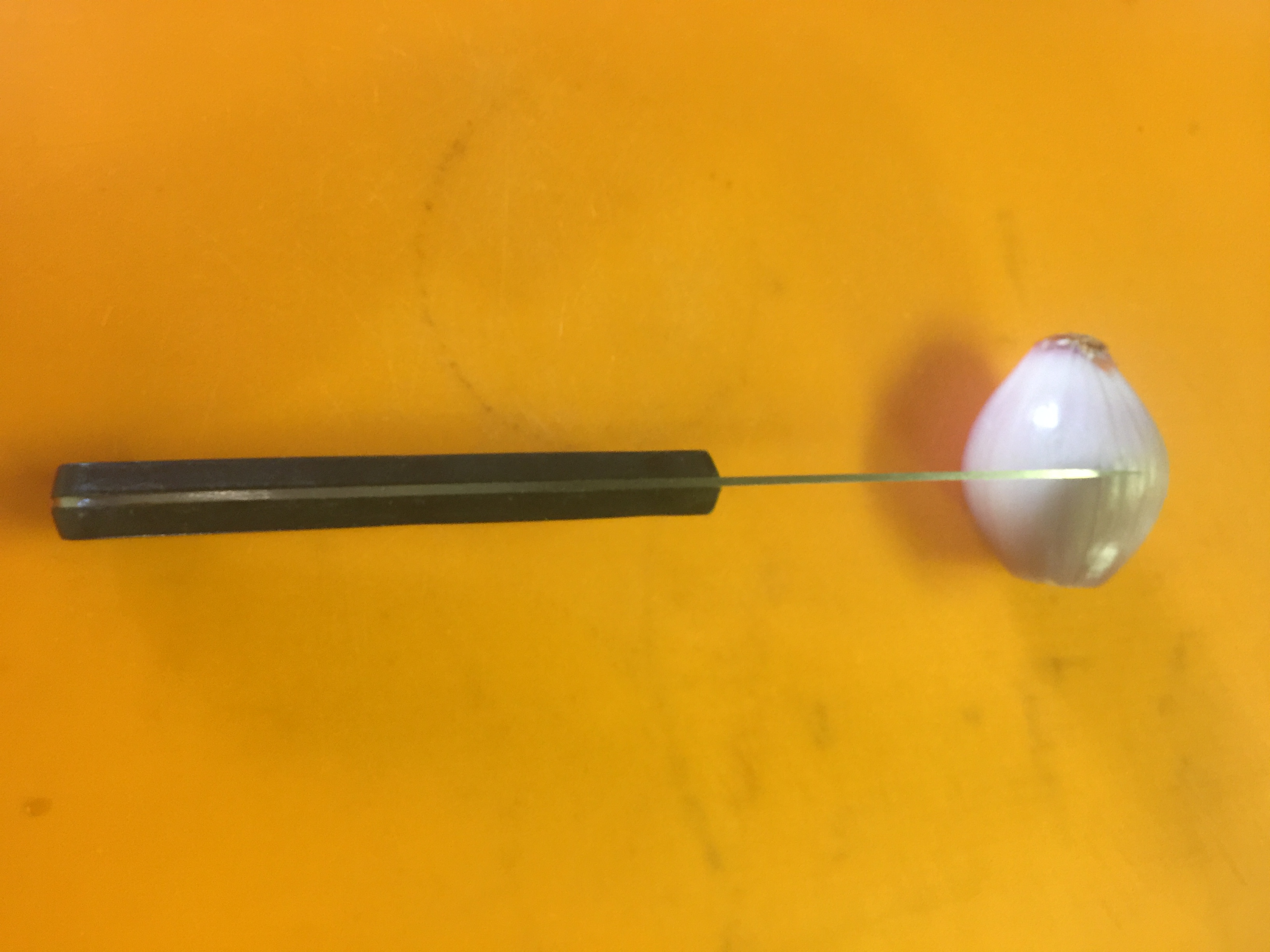 Please don’t cut off that stem. If you leave the stems on your onion, you will have a handle to use to do your fine dicing. If you watch the chef’s on TV dicing onions like a human Cuisinart, they never show cutting the end of the onion do they?