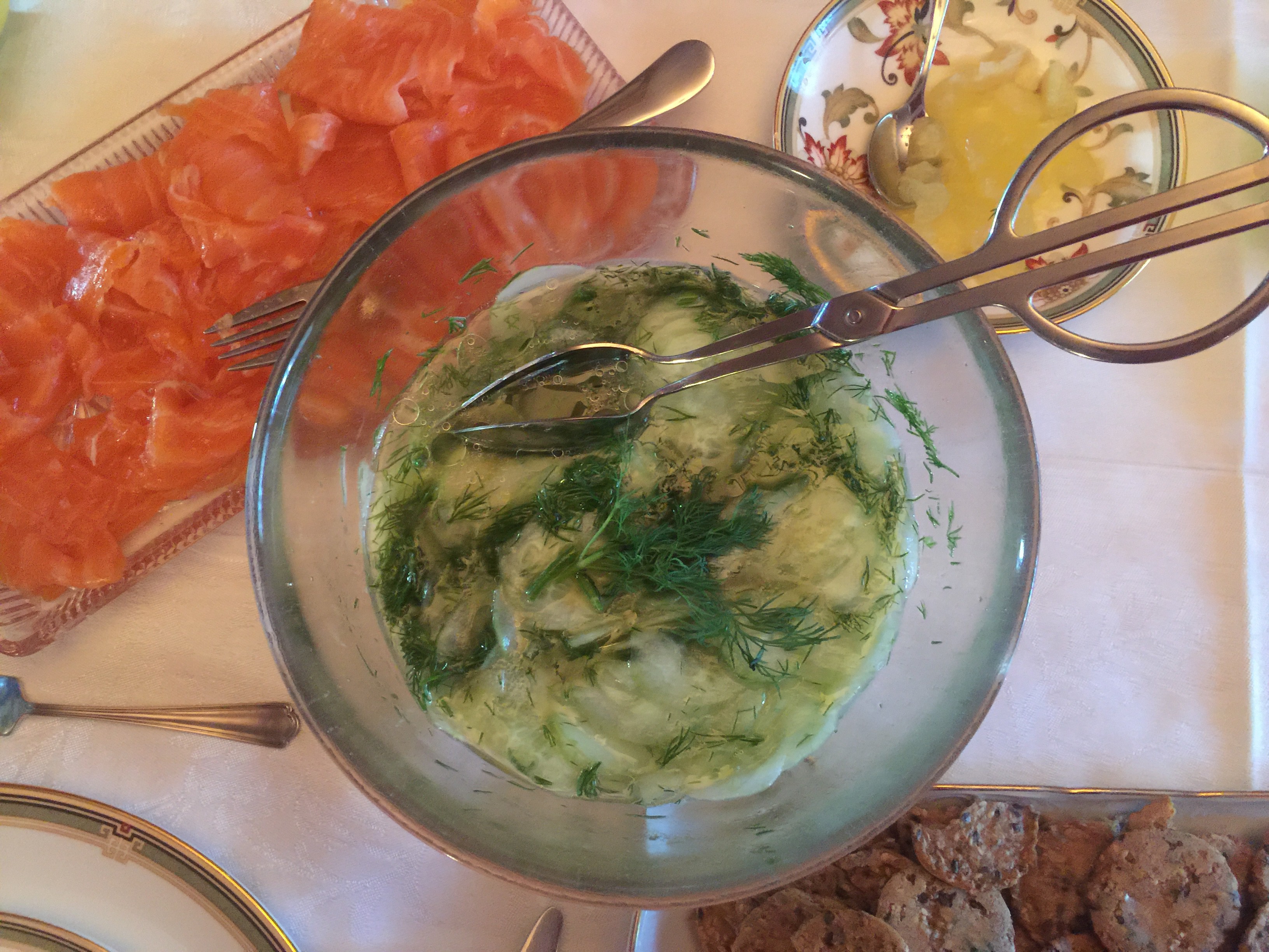 An excellent salad to accompany those tasty Finnish meatballs, meatloaf, smoked salmon and as a side dish for any meal. I brought the cucumber salad to my neighbour’s place. We had this salad with smoked salmon, capers, lemon, cream cheese and rye crackers. The cool cucumber salad cuts the richness of the smoked salmon in a most pleasant way. Since we are all of different nationalities, we discussed and critiqued other country’s versions of cucumber salad. The election was over after we counted the votes. My Dill~Cucumber Salad won!