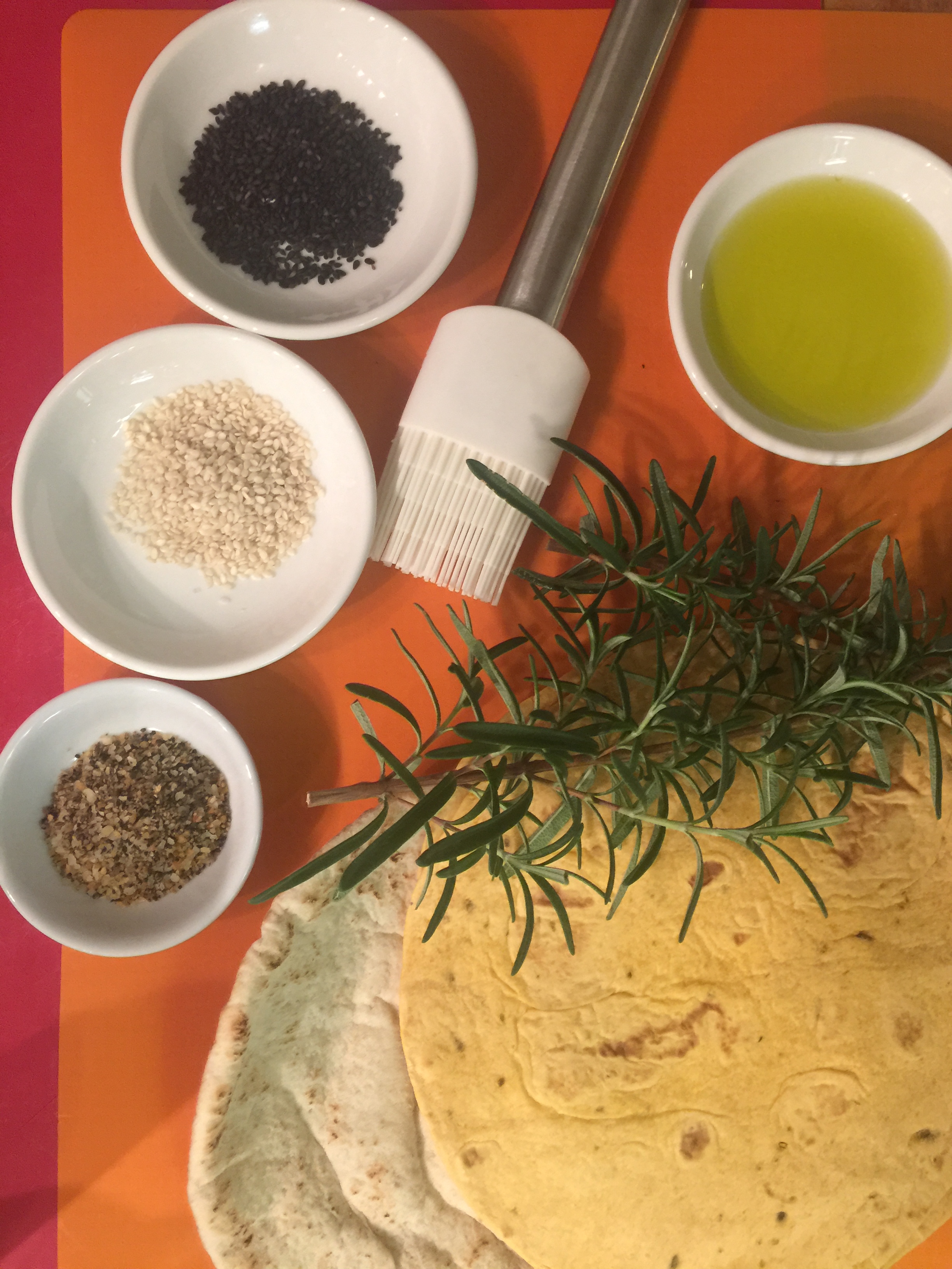 Tortillas, pita bread, black and white sesame seeds, steak seasoning, olive oil