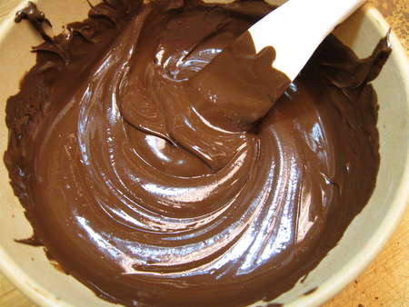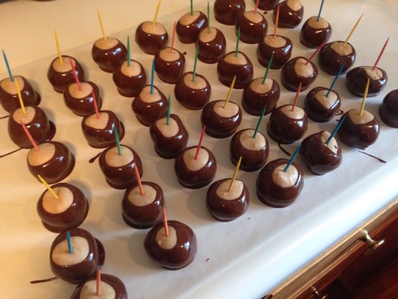 - Roll batter into small balls and dip into melted chocolate until almost but not completely covered. To do this, pierce the ball with a tooth pick and dip in the chocolate. Place on parchment and allow to set hard.