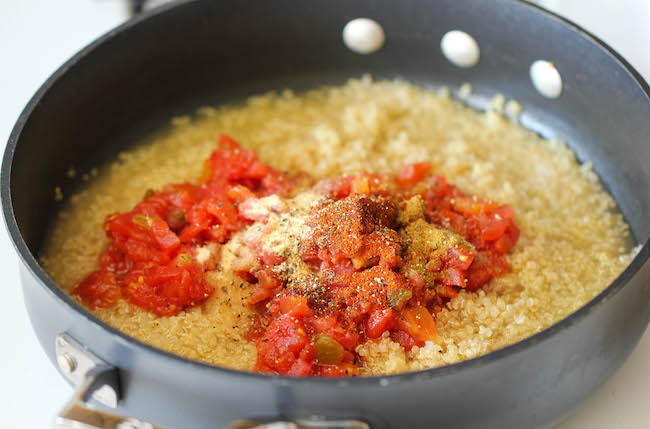 Add vegetable and quinoa, mix together with a wooden spoon. Add spices.