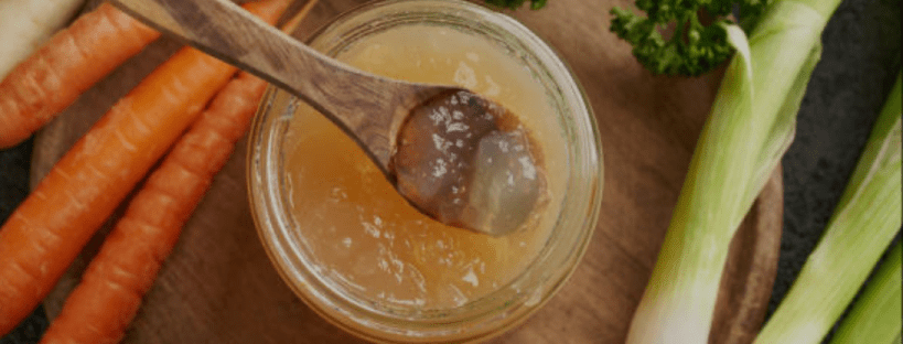 Cooled BONE BROTH turns into a gelatin. TIP: Soak bones with Apple Cider Vinegar (ACV) before cooking to encourage gelatin to be made. Chicken wings have the most gelatin. Also, chicken feet. But, chicken feet are hard to get. Never boil bones. Simmer or medium-boil to get good collagen; 8-10 hours. Over boiling will thin out collagen. Aides in Anti aging. Plugs up the holes from Leaky Gut.