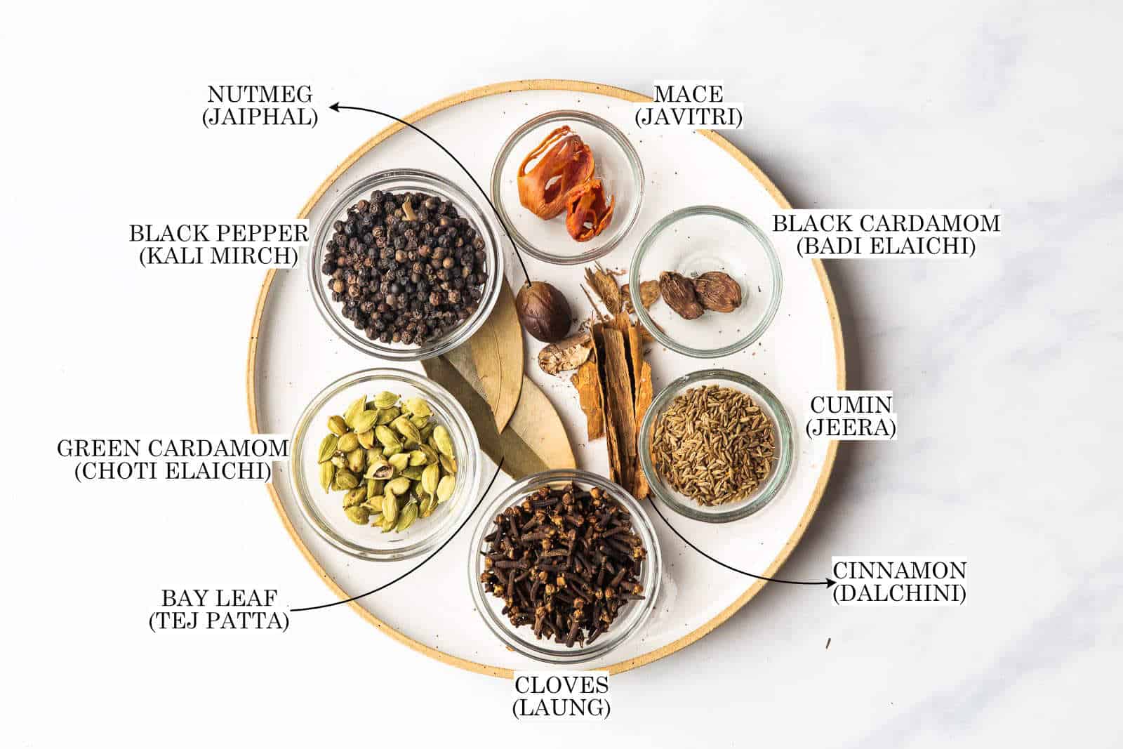1. Roast spices on a dry skillet (on a moderately low heat) to warm (Garam) up the spices (Masala); about 2 minutes. As soon as you smell an aroma, the spices should be ready. Remove the pan from the heat to cool before grinding. Some chefs remove the outer pod covering of the cardamon seeds