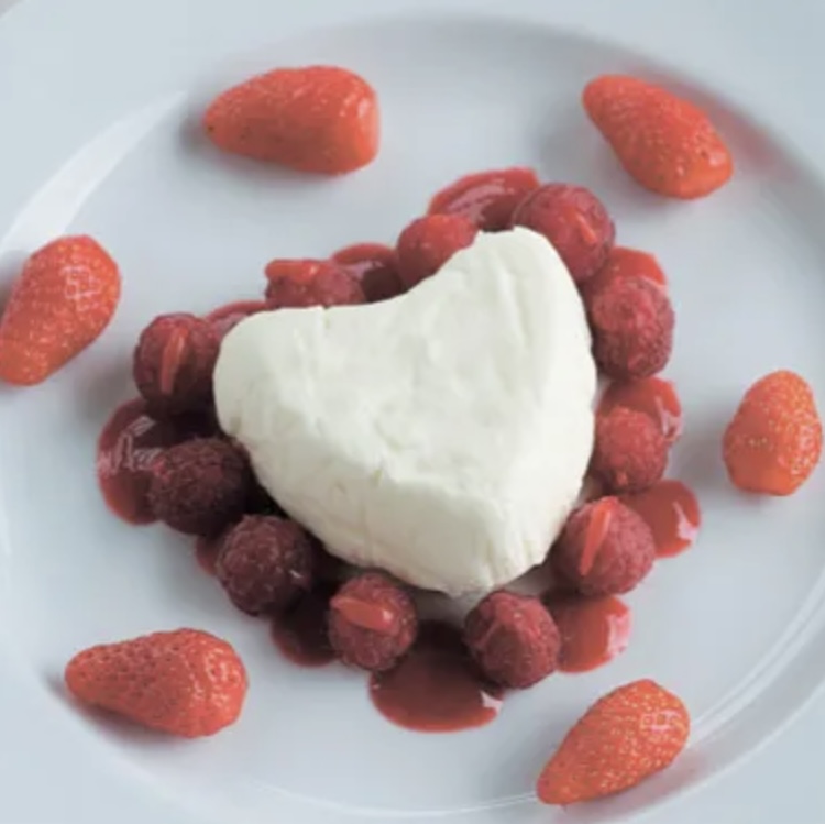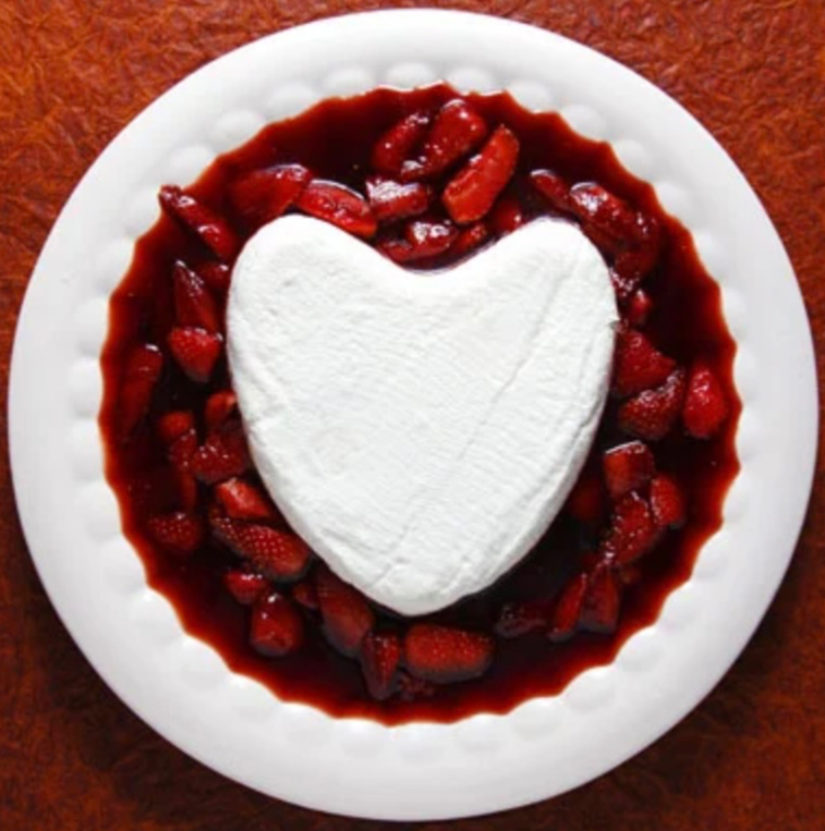 Make the coeur a la creme: Soak two 12″ x 12″ pieces of cheesecloth in cold water and squeeze dry. Put a 7″ heart-shaped coeur a la creme perforated mold on a fine-mesh sieve over a bowl; line mold or sieve with the cheesecloth, allowing the corners to drape over the side. Set aside.