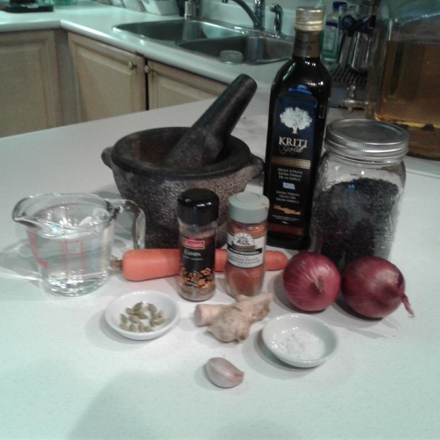 - Saute onion in coconut oil for about 5 minutes, or until translucent. Add the stock , turmeric, pepper, cumin, vinegar (or lemon juice), tamari, red pepper flakes and blended garlic. Reduce heat to low-medium.